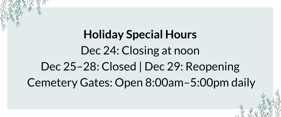 Please note that Cemetery bylaws are enforced. This is to ensure that the grounds remain a peaceful and pristine place where the memory of loved ones is honoured, and those who grieve feel welcome. Learn more about the bylaws here.